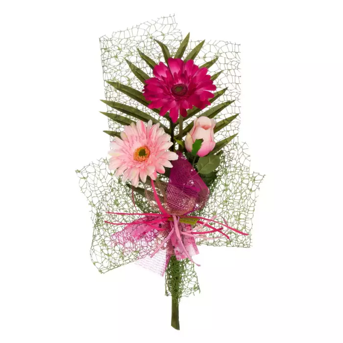 Ramo floral artificial compuesto por dos gerberas de color cereza y rosado con una rosa bicolor.