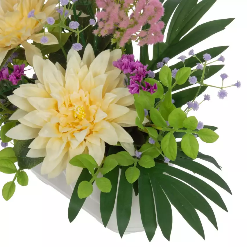 Centro floral con dalias y freesias artificiales en color amarillo y fucsia con flores y hojas de relleno.