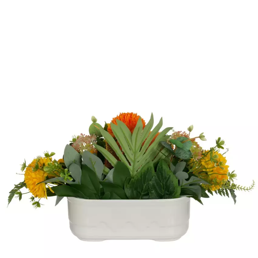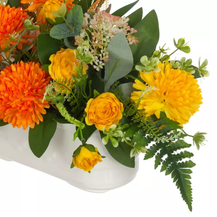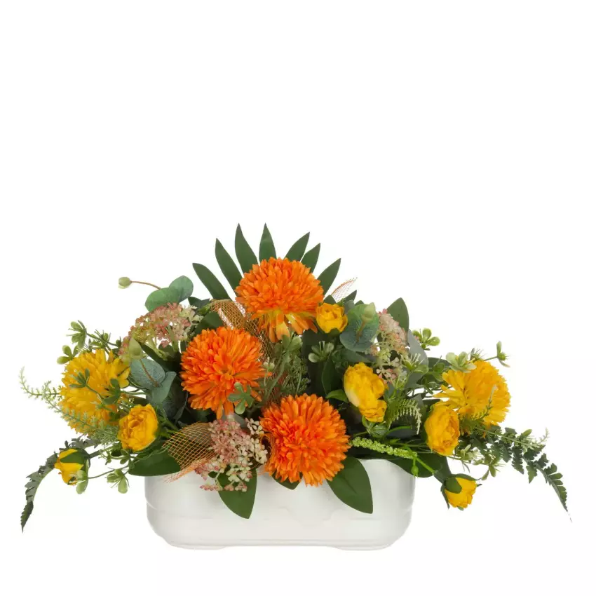 Centro floral con rosas y pom poms artificiales en color amarillo y naranja con flores y hojas de relleno.