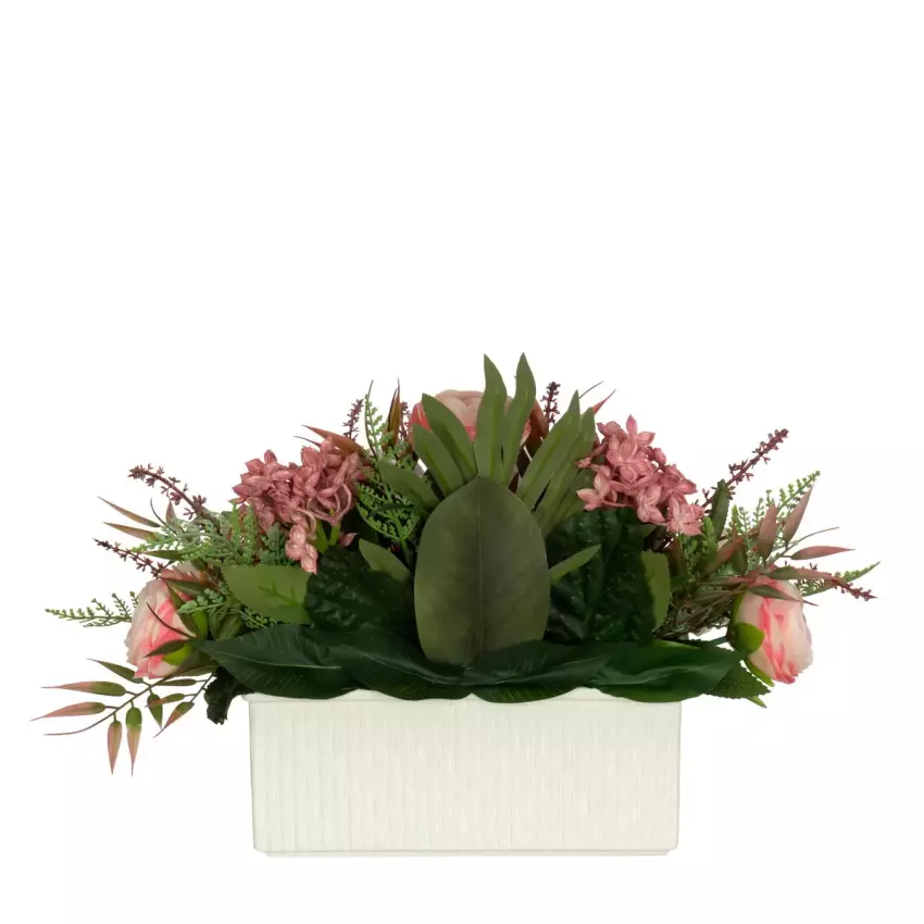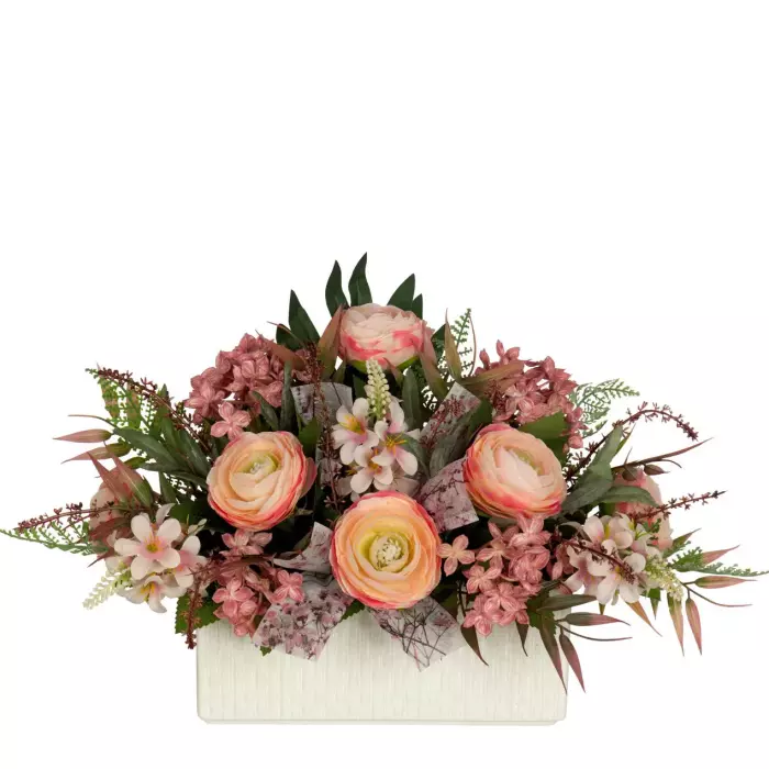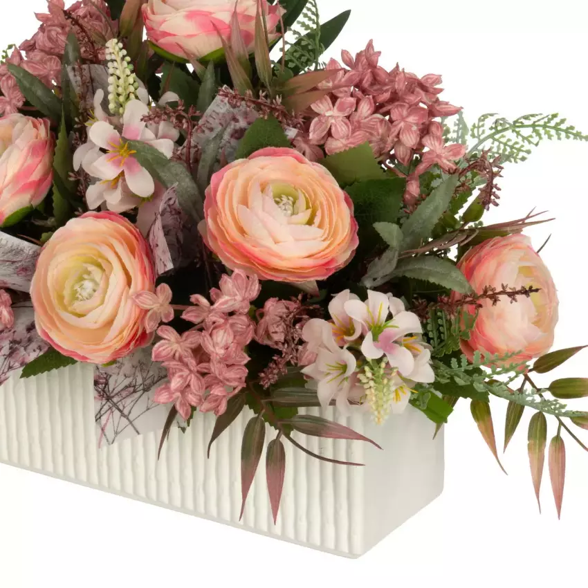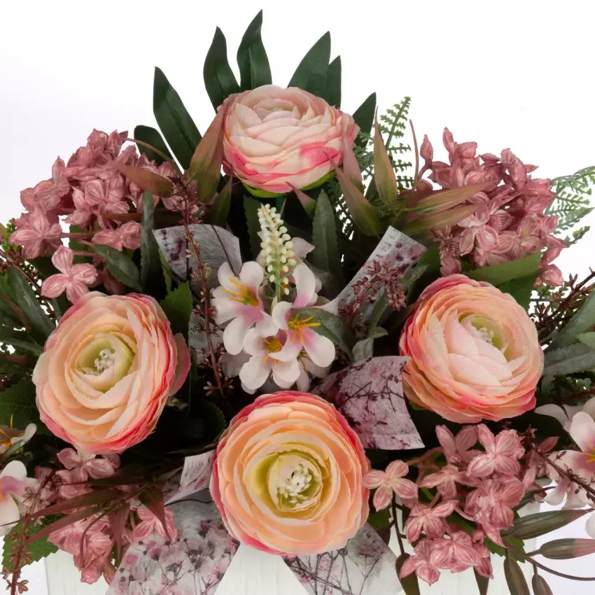 Centro floral con ranúnculos artificiales en color rosado con flores y hojas de relleno.