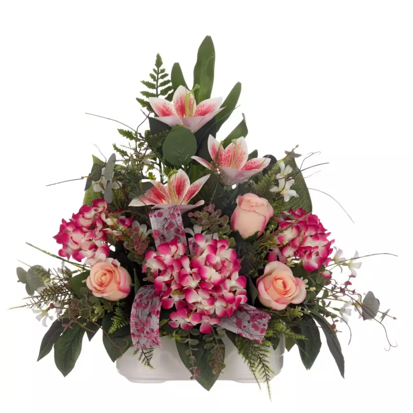 Jardinera cementerio flores artificiales rosas y hortensias fucsia 45