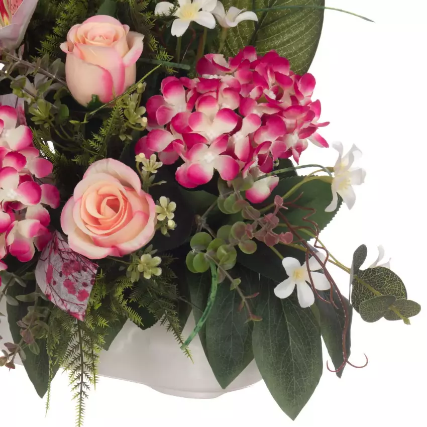 Centro floral con rosas, hortensias y liliums artificiales en color fucsia con flores y hojas de relleno.
