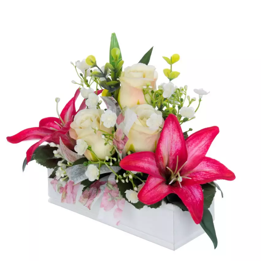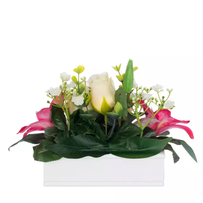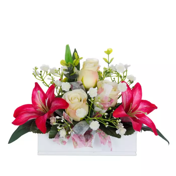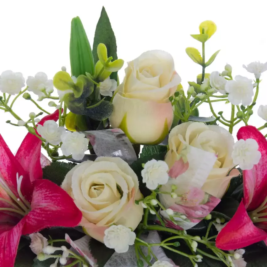 Jardinera cementerio flores artificiales rosas y lilums blanco 17