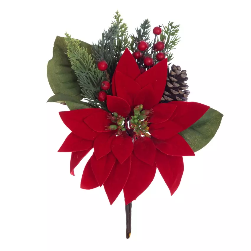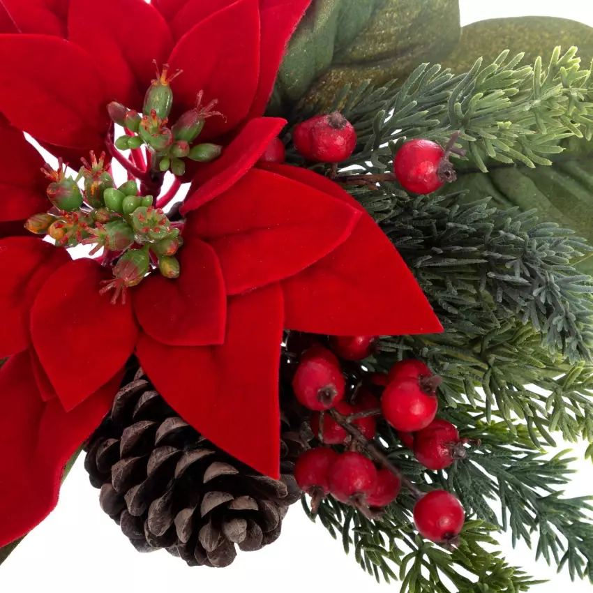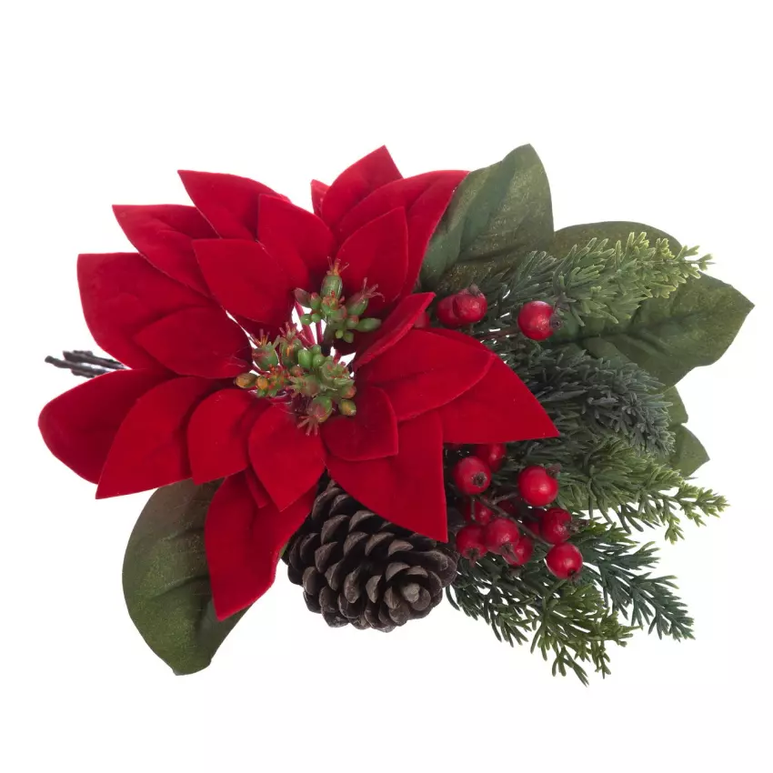 Bush artificial con una flor de poinsettia roja, berries, una piña y hojas de relleno.