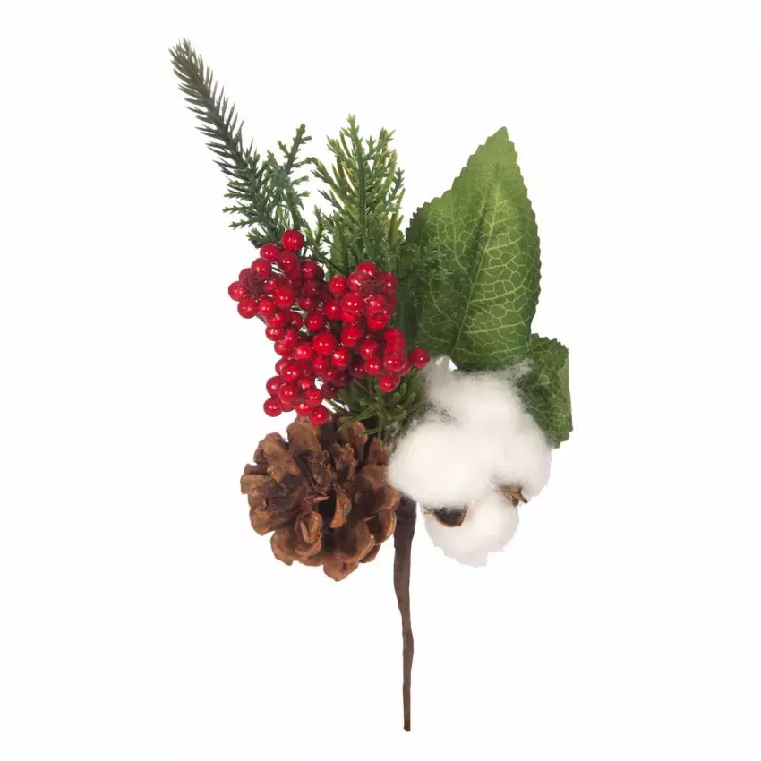 Con bolas de acebo, una piña natural, un pedazito de algodón y hojas de relleno.