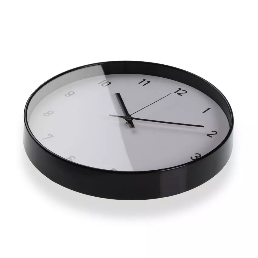 Reloj de pared negro blanco.Funciona con una pila AA 1,5v. (pila no incluida)Diámetro 29.7 cm.Alto 4.2 cm.Material PVC.Peso 0.550 kg.