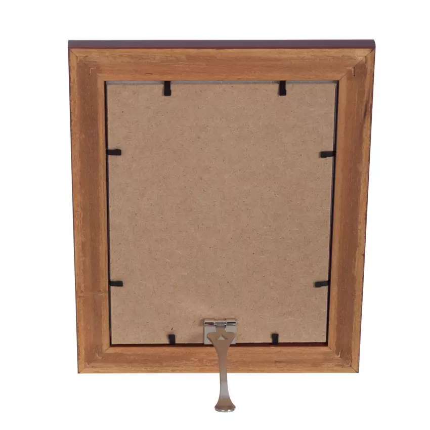 El portafotos incorpora un soporte metálico articulado que se fija en la trasera, mediante un anclaje, que permite ajustar la inclinación del marco.